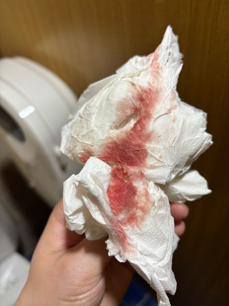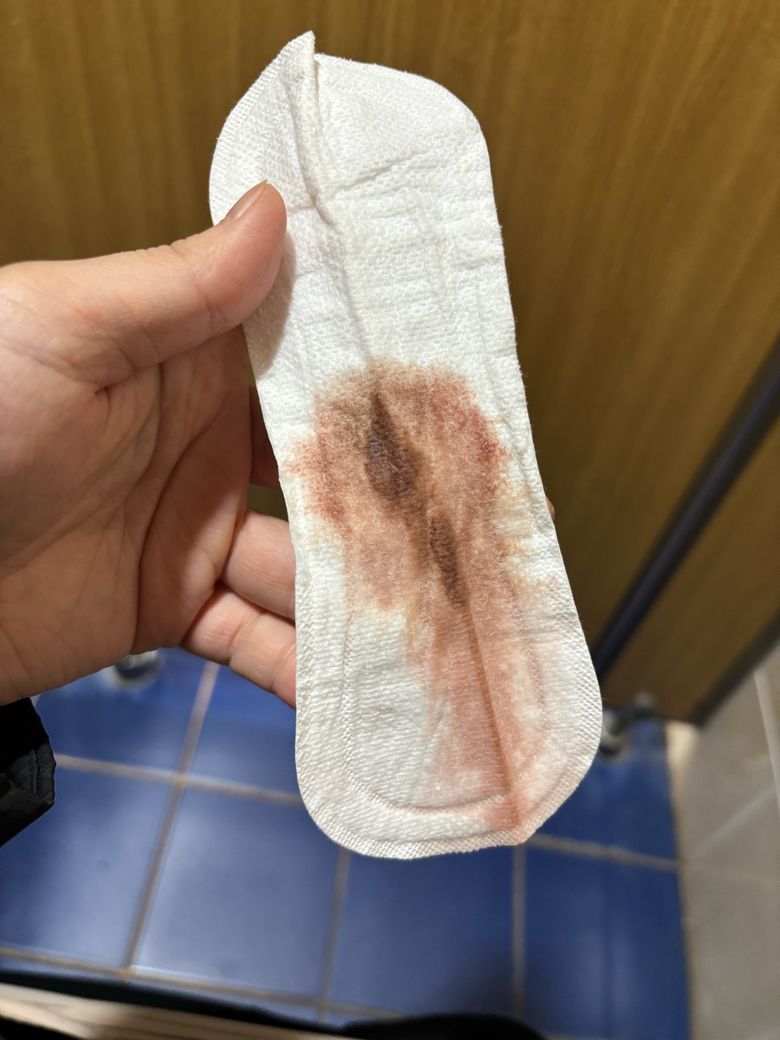 사진상 소량의 갈색 혈흔으로 보이며, 신선한 출혈보다는 오래된 혈액 양상입니다. 다만 이 소견만으로 착상혈과 생리를 명확히 구분하는 것은 불가능합니다.