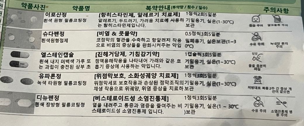 비염 및 인후통으로 처방받은 약에 소염진통제가 포함되어있습니다.