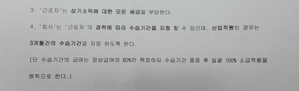 계약서 두 개 모두 수습기간 동안 최저임금의 80%를 지급하고 3개월이 지나면 그동안 떼간 20프로 3개월치를 돌려준다는 소리인데 제가 4개월만 일을 하고 나왔다고 사장님이 한 달치 월급만 주겠다고 하셨습니다.