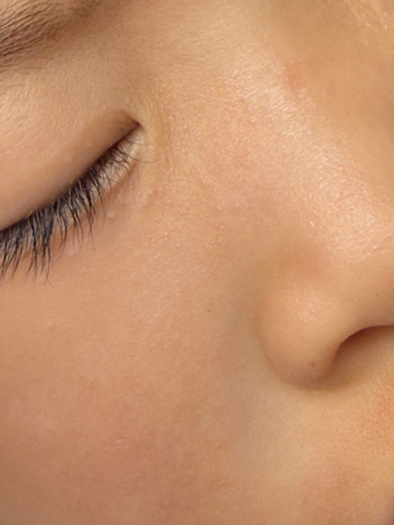 사진상으로는 코 옆과 눈가 주변에 경계가 뚜렷하지 않은 옅은 홍반과 미세한 각질이 보이며, 전형적으로 “소아 얼굴 건조성 피부염(자극성 또는 아토피 초기 형태)”에 가까운 양상입니다. 가려움이 거의 없을 수도 있고, 번지듯 퍼지는 형태로 나타나는 경우가 흔합니다.
