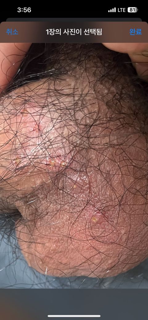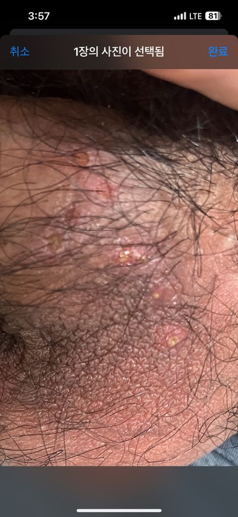 올려주신 사진상 헤르페스나 곤지름 등의 성매개성 질환에서 관찰되는 수포성 병변이나