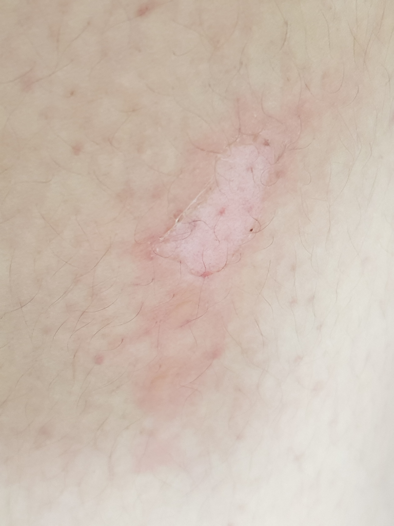 얕은 2도 화상정도로 평가됩니다. 마데카솔이나 후시딘 같은 연고정도는 사용에 문제가 없을테니 발라보시고 메디폼으로 덮어두시면 되겠습니다. 회복까지 약 2주정도의 기간이 필요할 것으로 예상됩니다.