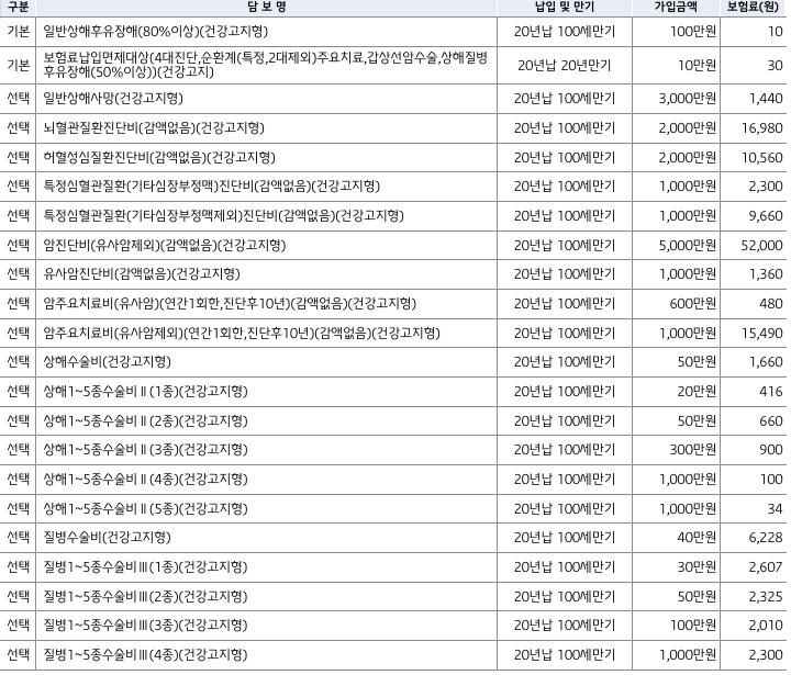 3대중대질환에 대한 진단비와 수술비 암치료비 에 관한 담보로 구성되어 있으며 비갱신형으로 100세만기로 20년 납입으로 그다지 나쁘지 않습니다 상해도 같이 설계가 되었다면 좋지 않았을까하는 아쉬움은 있습니다