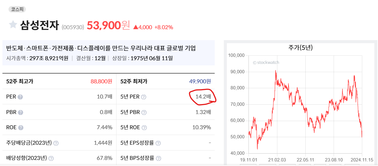 삼성전자는 14.2이고 현재 10.7입니다. 이걸로만 봤을때는 단순히 주가는 낮은 수준인거 같습니다.