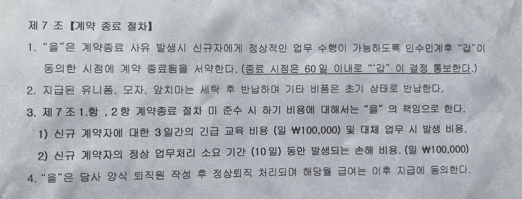 6. 아래 첨부 사진은 계약서에 있는 퇴사 조항입니다. 사장은 저 조항에 대해 설명을 위 글과 같이 이야기 하고 넘겼습니다. (추가로 사장은 계약서를 작성 당시 저와 다른 매니저 계약서를 읽었습니다. 매니저 계약서와 저의 계약서는 내용이 달랐습니다.)