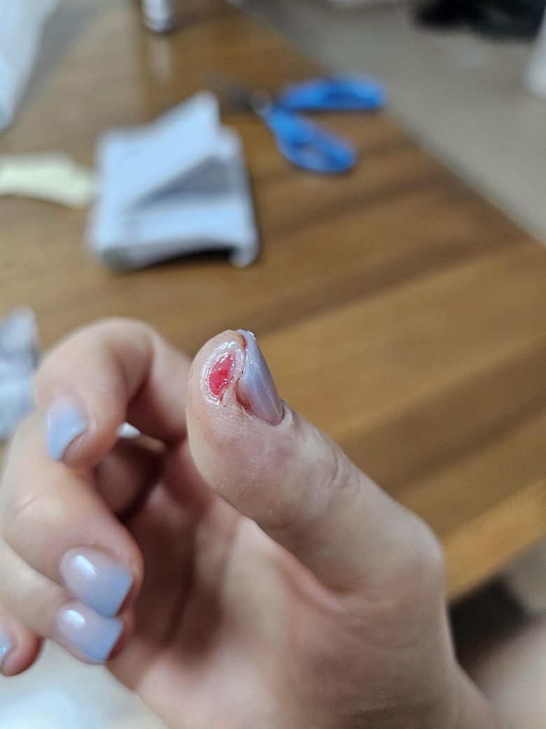 사진상 정확한 상태를 확인이 어려우나 상처 부위가 생가보다 커 보이며 정확한 상태 파악을 위해 병원에 방문하시어 상태 검사 받아보시고 적절한 조치를 받아보시는 것을 추천 드립니다. 시간이 지나면서 회복될 가능성이 높기는 하지만 혹시라도 감염등의 문제가 발생할 수도 있으니 검사 받아보시면 좋을 것 같습니다.