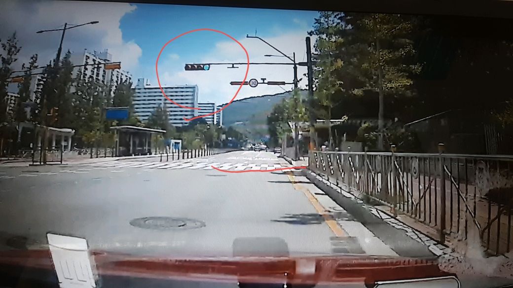 안녕하세요? 어린이보호구역 무인카메라 앞에 신호등이 있었는데 파란색신호등보고 주행중 무인카메라 앞의 횡단보도선을 반쯤