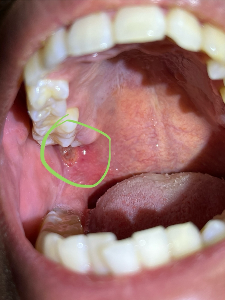아프타성 구내염 또는 상악사랑니의 물리적 자극에 의한 손상 둘 중 하나일 가능성이 높습니다.