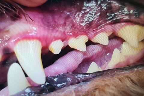 올려주신 사진을 보면 2개의 뿌리를 가지고 있는 전구치의 뿌리 사이 공간이 노출될 정도로 치은이 내려가 있습니다.