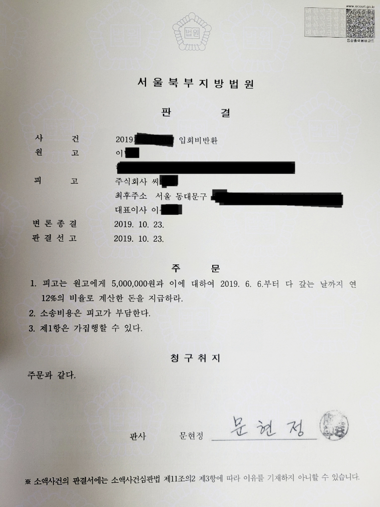 1. 피고가 주식회사인 것을 보면 피고는 자연인이 아니라 법인에 해당합니다. 대표이사는 법인의 대표자일 뿐 대표이사 개인이 법인의 채무에 대해서 책임을 지지는 않습니다. 따라서 법인인 회사를 상대로 지급받으셔야 할 것 같습니다.