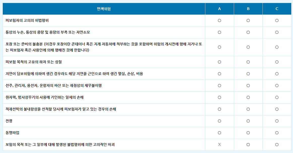 A는 전위험담보조건으로서 보험료가 가장 높으며, B와 C는 열거된 위험만 담보하는 조건이므로 A에 비해 보험료가 저렴합니다. 다만, 전쟁위험 및 동맹파업위험의 경우 별도의 특약으로 가입이 가능하지만, A조건에서도 선박의 감항성 등, 고의 누손 등에 대해서는 면책으로 규정하고 있습니다. 수출자가 부담하는 인코텀즈 조건에는 CIF와 CIP 조건이 있습니다. 수출자가 보험가입을 하여 의무적으로 비용을 부담해야 합니다.
