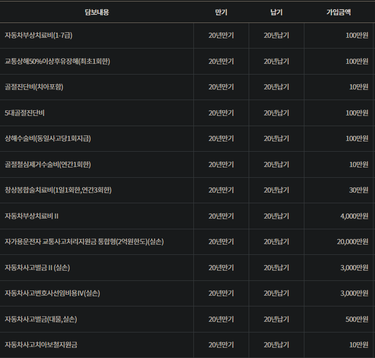 이 특약들이 핵심이며 이 외에는 실비 및 종합보험에서 보장이 되기 때문에 중복 구성하실 필요가 없습니다