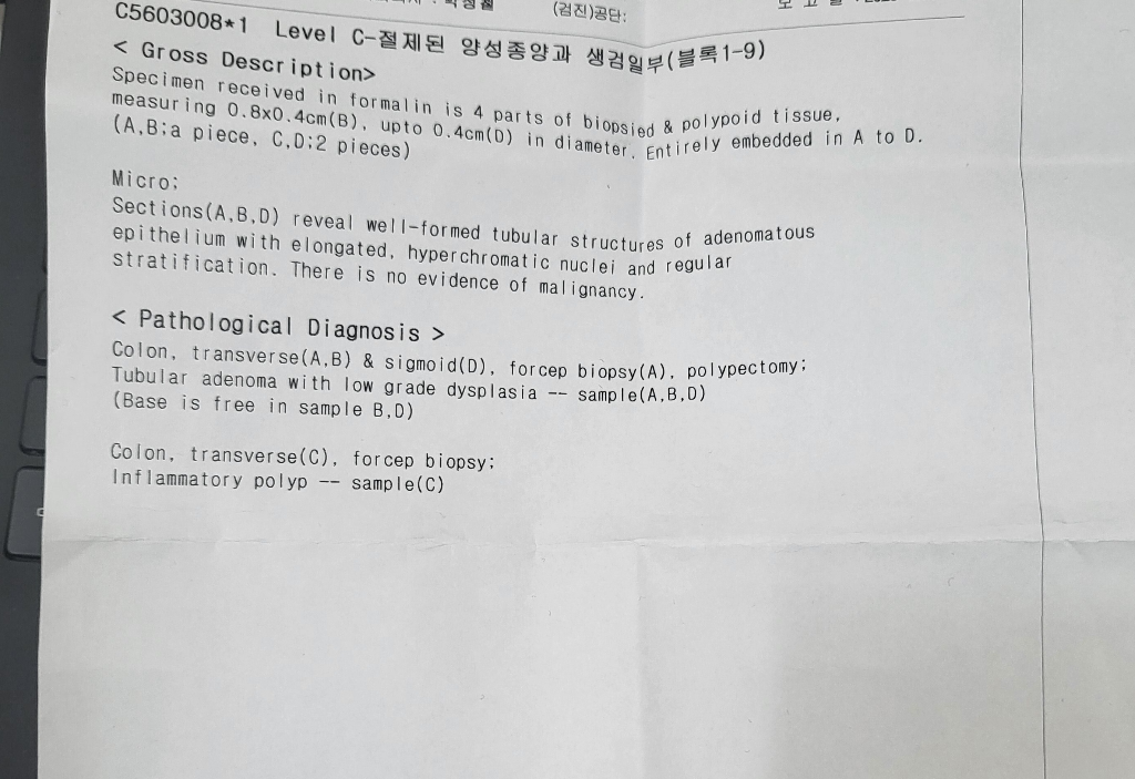 횡행결장에서 세 개(A, B, C), S자 결장에서 한 개(D) 얻어졌고 A와 C는 조직검사를, B와 D는 용종절제술을 시행했습니다. A, B, D는 저위험 이형성을 동반한 선종으로 진단되었고 B와 D의 용종절제술은 선종을 남기지 않고 깨끗하게 절단되었습니다. C는 염증성 용종이었습니다.