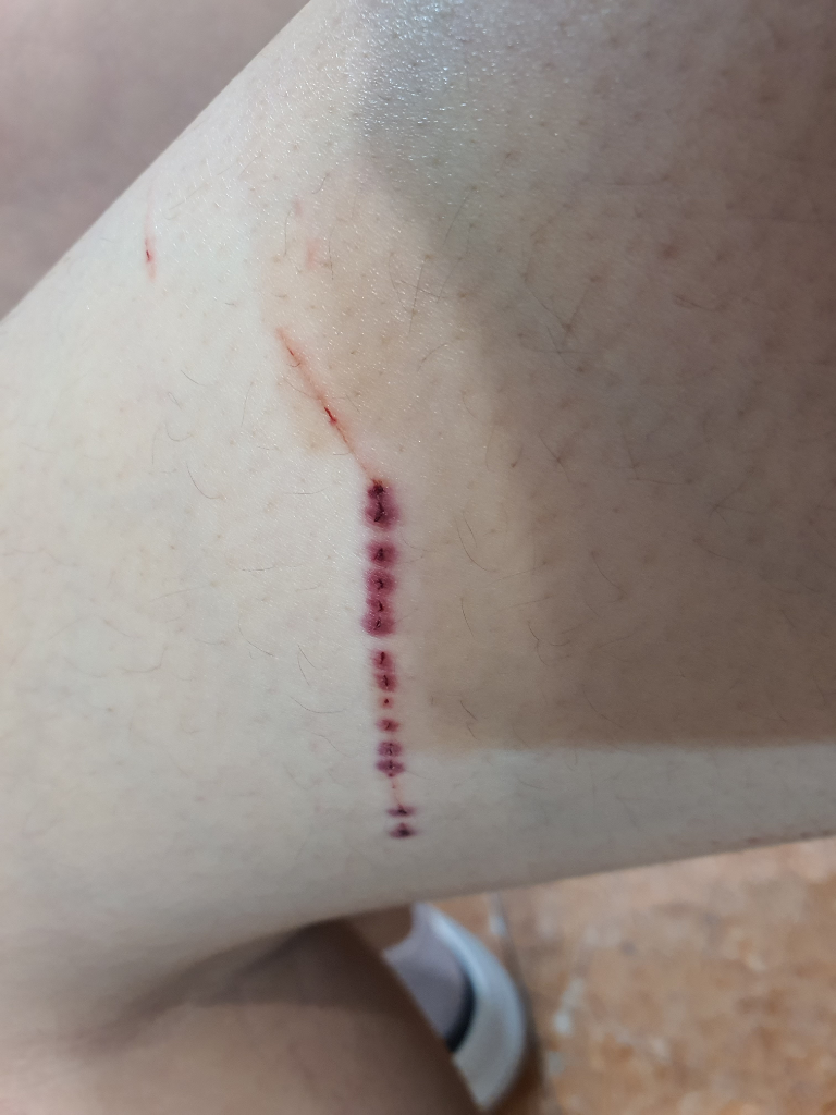 만약 개인사정으로 병원을 가시기 어렵다면, 포비돈요오드를 상처 부위와 가까운 옆쪽에 도포해주시고 거즈붕대나 밴드를 붙여두는 것이 좋습니다. 상처 부위에는 후시*이나 광범위항생연고를 발라주시면 감염방지에 도움이되실 수 있습니다. 붕대나 밴드는 이틀정도만 유지하고 떼 낸뒤에 상처부위가 붓거나 하지 않았다면 재붕대는 따로 하지 않으셔도 괜찮습니다.