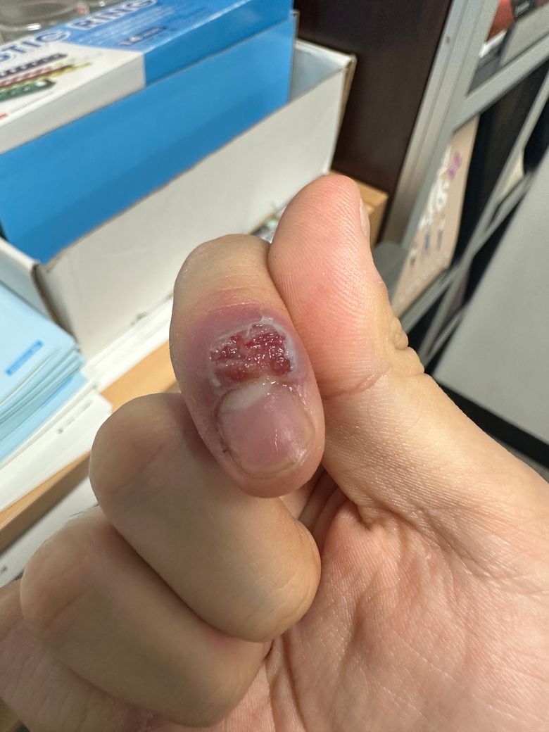 제가 손톱 튀어나온걸 뜯다가 검지 손톱위쪽이 곪은 듯한 상처가 생겼는데, 어떻게 해야할까요? 일단 연고만 바르고 있는 상태입니다. 한 3~4일 쯤 됐어요