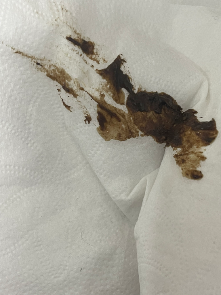 사진상으로는 출혈로 인한 흑변 (melena) 인 것으로 보이지는 않습니다. 멜레나는 더 검은 짜장색으로 니오며 변비형태가 아니라 무른 끈적이는 형태가 되고 특유의 이상한 냄새가 납니다.