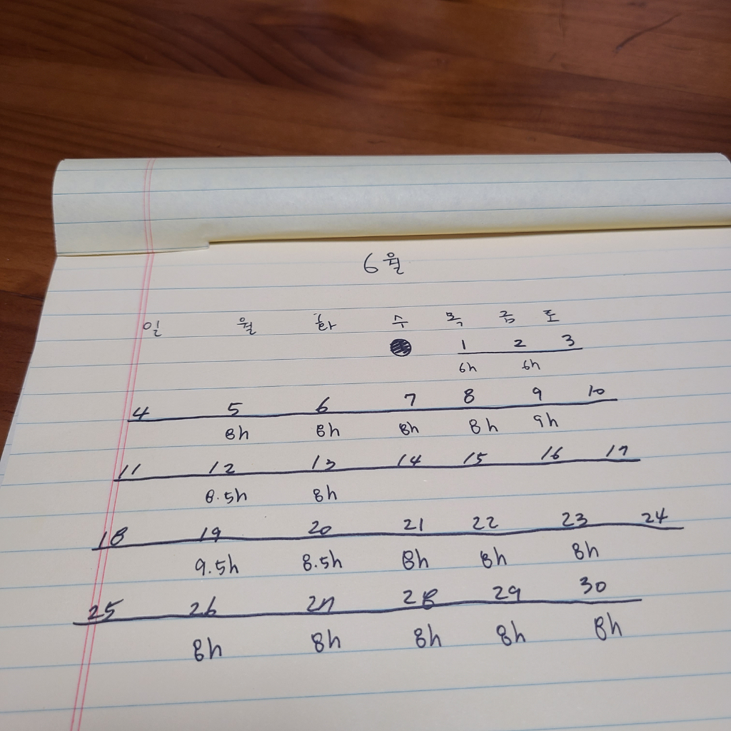 *6월 2일까지 주 5일 6시간으로 근무하다 5일부터 주 5일 8시간으로 근무시간이 변경되었습니다