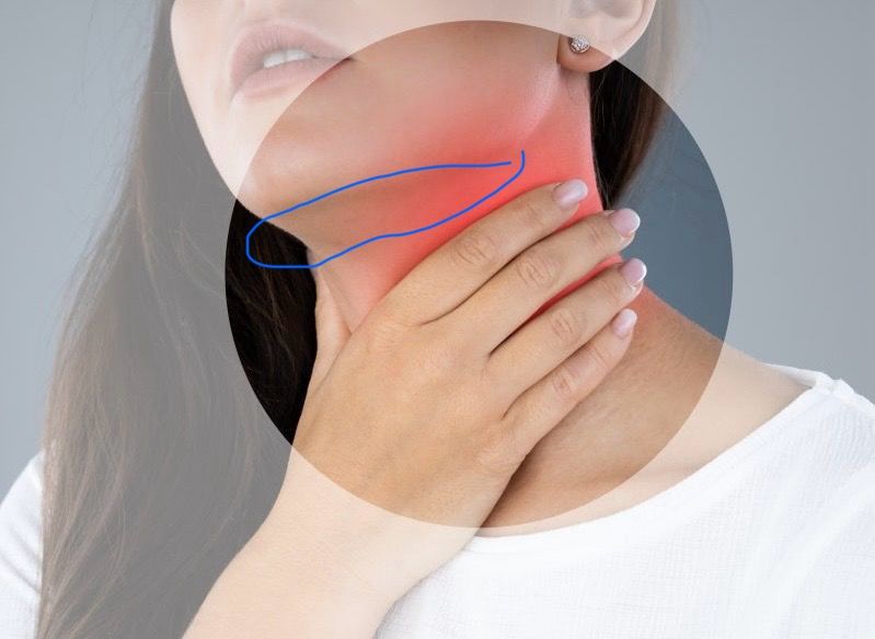 노래방에서 노래 한 곡 부르고 나니 갑자기 목 아래 턱 부분이 아파요 고개를 들면 더 아프고 고개를 움직이면 약한 통증이 있어요 사진에 파란색 부분 쪽이 아파요 이유가 뭘까요?? ㅠㅠ