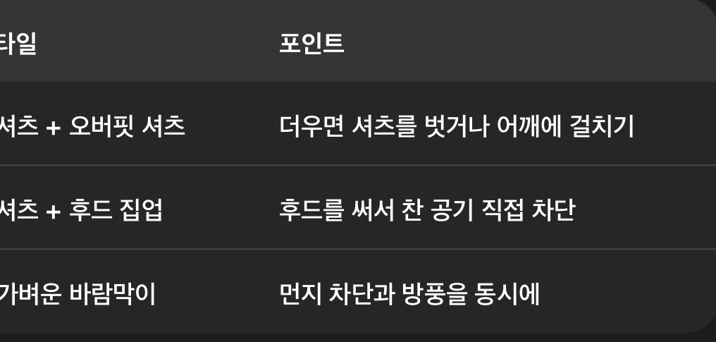 • 후드 활용: 바람이 심할 때는 후드를 써서 머리와 귀를 보호하는 것만으로도 체감 온도가 3~5도C 정도 올라갑니다.