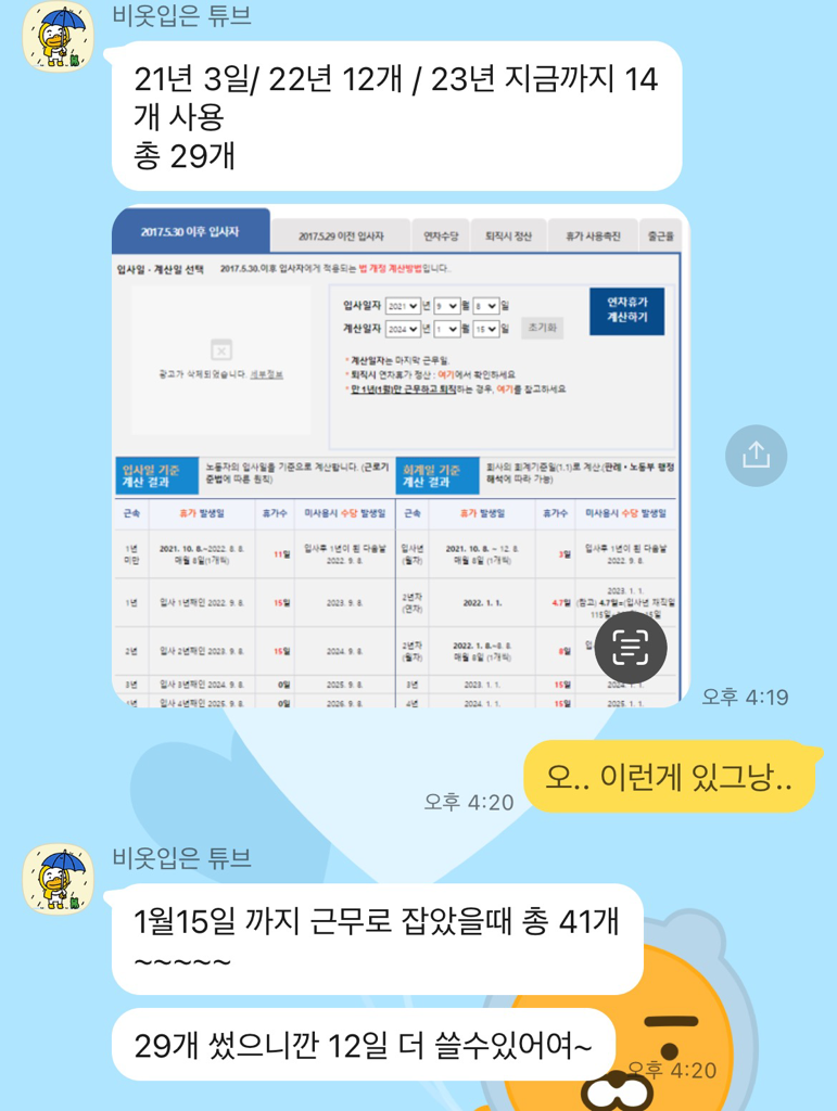 위 사진은 경지팀에서 제 연차갯수를 계산해서 보여주신 거예요.. 참고 부탁드립니다!
