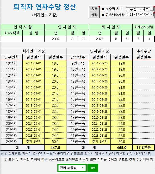 참고로 위는 입사일 기준으로 계산한 것입니다. 회계연도 기준으로 계산하여도 결과는 같습니다.