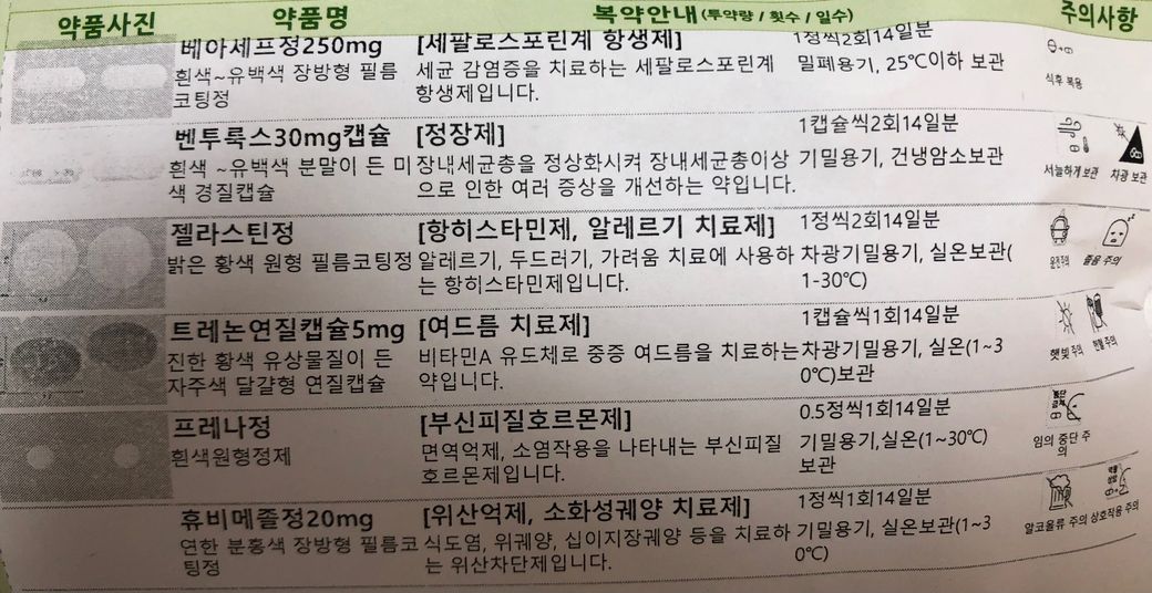 다이어트 약인 디에타민(펜터민)은 교감신경을 자극하여 식욕을 억제하는데, 피부과 약 중 프레나정(스테로이드제)과 병용하면 불면증과 심계항진 부작용이 크게 증폭될 수 있으며 트레논연질캡슐(이소트레티노인)과 함께 드시면 간에 무리를 줄 수 있습니다. 또한 항생제(베아세프정), 항히스타민제(젤라스틴정), 위장약(휴비메졸정), 정장제(벤투룩스캡슐) 등 복용하시는 약의 가짓수가 많아 상호작용 위험이 크므로, 피부과 치료를 완전히 마친 후 다이어트 약 복용을 시작하시는 것이 안전합니다.