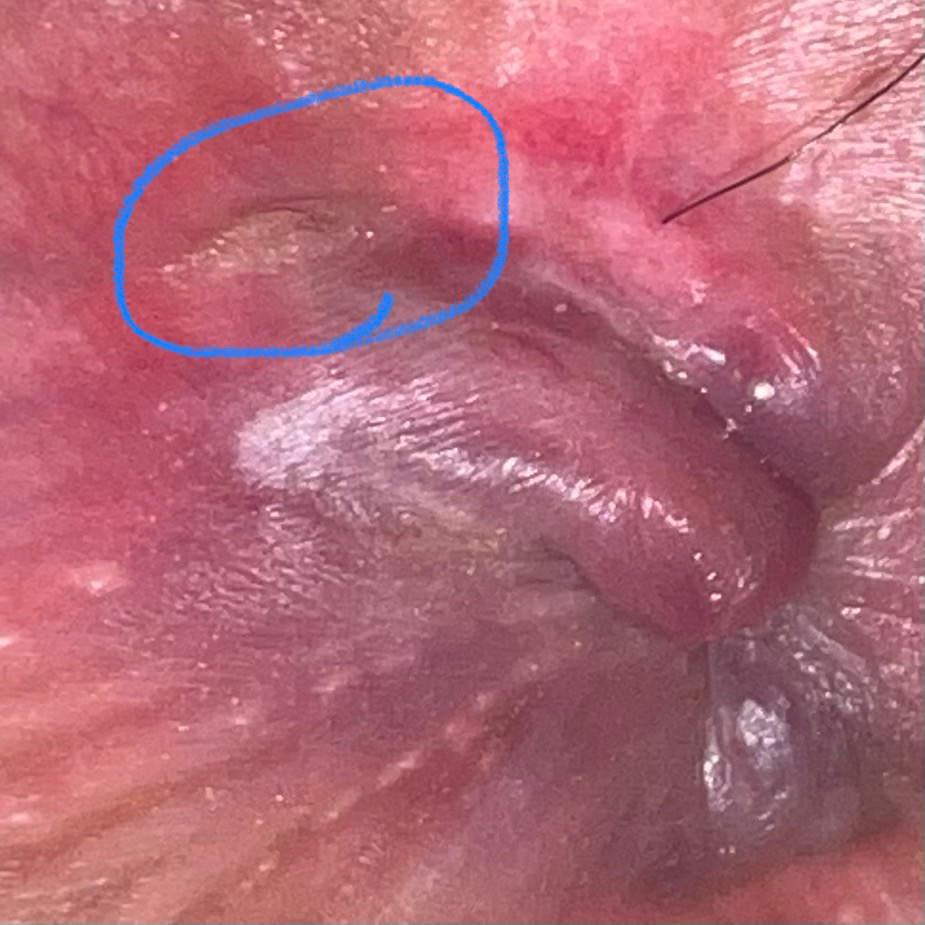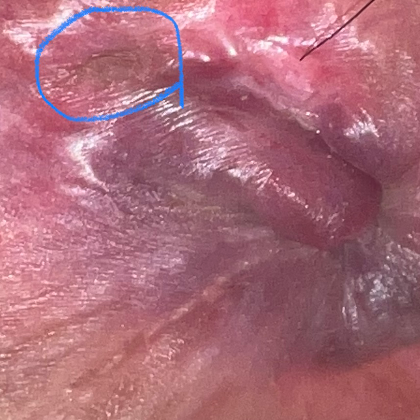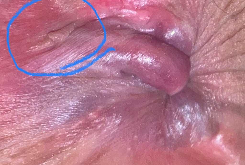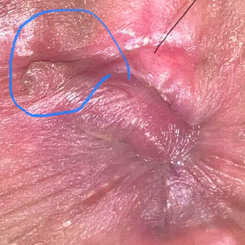 항문의 피부병변으로 고민스러우신 것 같습니다. 사진으로 보아 치핵이 있으신 것 같고, 동그라미친 부분은 치핵이나 치열 등의 염증반응으로 인해 피부가 늘어난 부분으로 보입니다. 곤지름 병변으로 보이지는 않습니다.