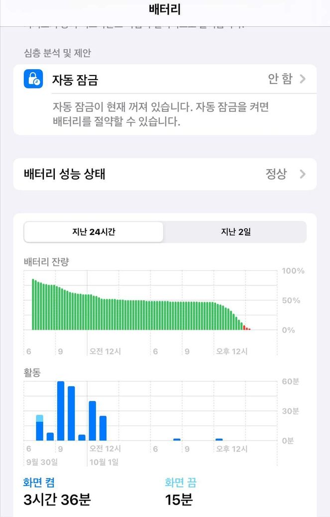 그래프를 보면 오후 12시 이후에 사용이 없는데도 배터리가 계속 줄어든 게 맞네요. 새 제품인데도 배터리가 저렇게 방전되는 건 아주 드문 경우지만, 백그라운드 앱이나 위치, 알림 같은 시스템 기능으로 배터리가 쓸 수 있습니다. 불량이라 단정 짓긴 어렵지만, 그래도 새 제품이라면 우선 재설정, 최신 업데이트 적용, 백그라운드 앱 종료 등을 해보고 똑같으면 AS를 받는 게 안전하다고 생각합니다. 개인적으로는 초기에는 배터리 교정(완충-완방 두 번)하고 관찰하는 것도 괜찮은 방법입니다.
