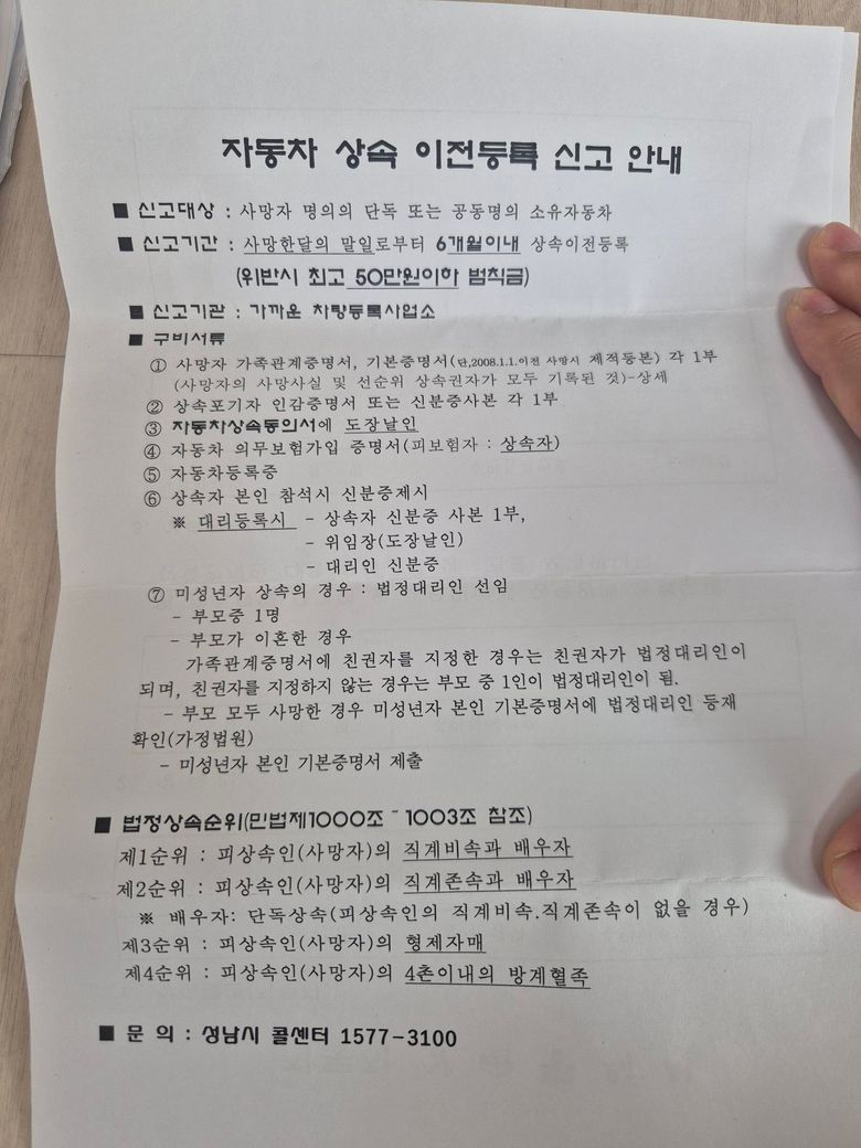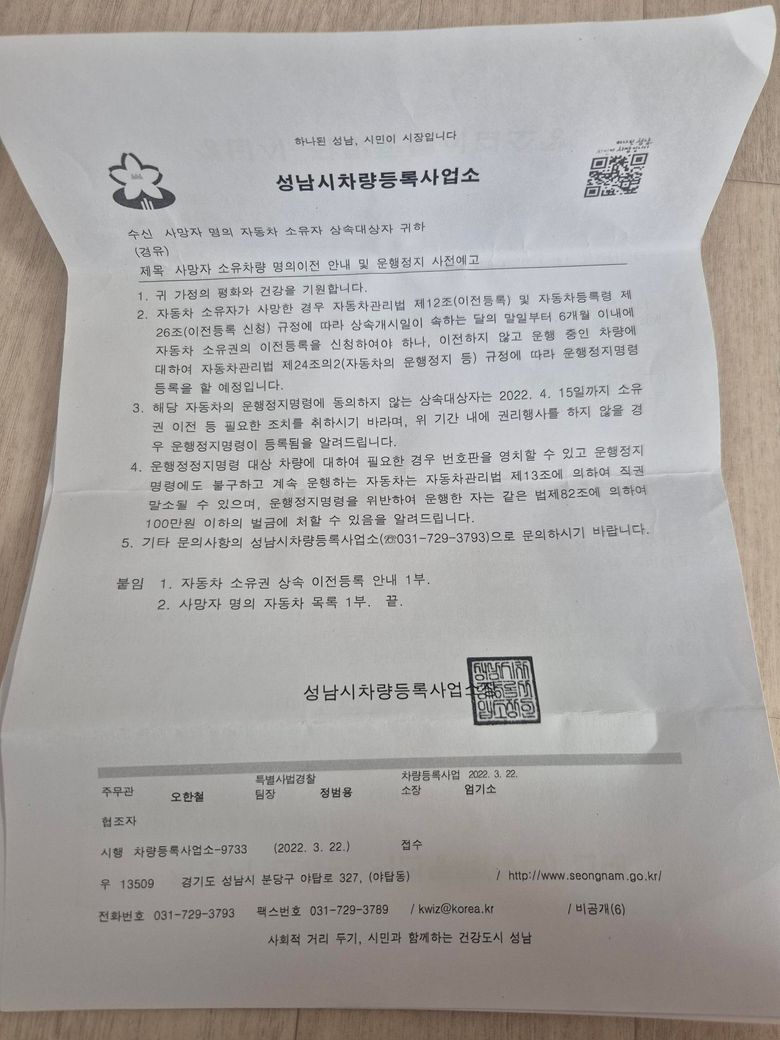 아버지의 한정승인 판결까지 모두 마치셨는데 6~7년이 지나 차량등록사업소에서 우편물이 와서 매우 당황스럽고 찝찝하실 것 같습니다. 본 적도 없는 차량에 대해 범칙금이나 의무보험 내용까지 적혀있어 불안하신 마음이 충분히 이해됩니다.