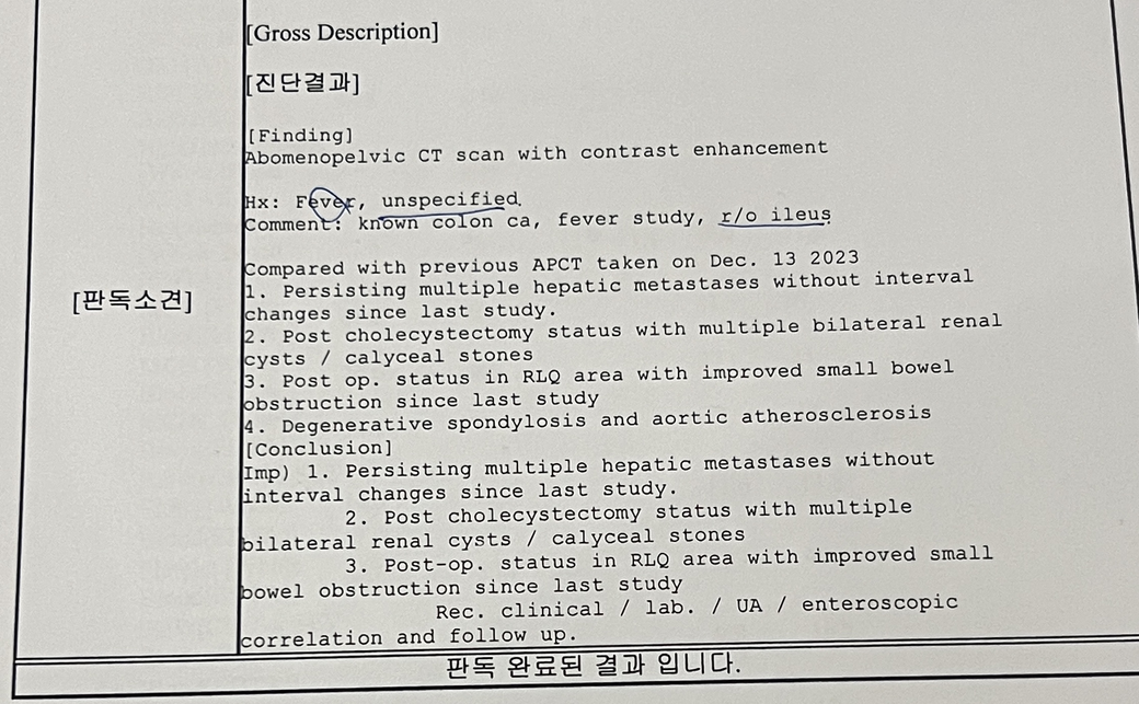 판독결과에는 간에 여러개의 전이가 있었는데 이번에 큰 변화가 없다고 합니다