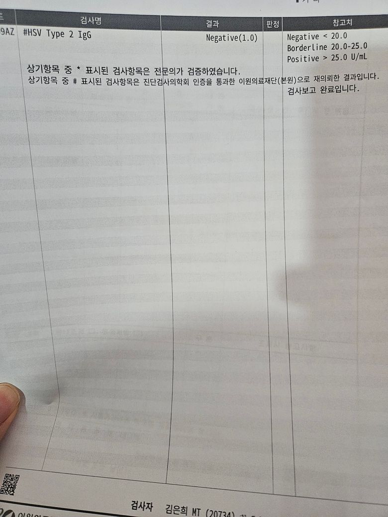 네 검사 결과에 따르면 헤르페스 2형 음성입니다. 25이상이 양성이고 20이상이 경계 인데 1이면 음성이니 걱정 안하셔도 될듯해요