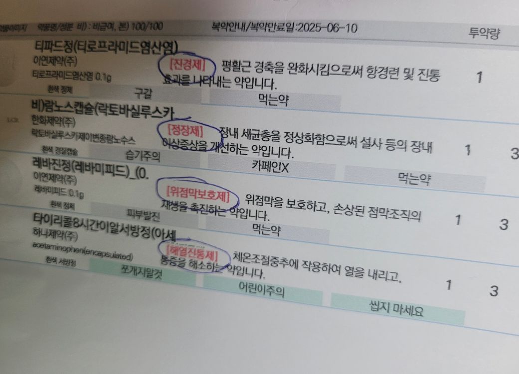 증상완화제들을 주셨네요. 해열제랑 진경제, 유산균을 주셨습니다. 정확한 진단명은 알 수 없지만 일시적인 배탈정도로 보신 것 같습니다.
