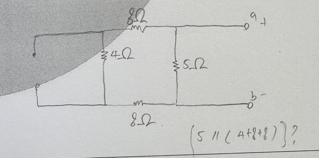 이 사진에서 8,4,8옴은 직렬형태인가요? 맞다면 이유는 무엇인가요? 그리고 왜 5옴과 (8+4+8)은 병렬인가요? 4옴에 (8,5,8) 병렬 뭐 이런식으로는 안되는건가요? 사진 한번 보고 자세히 설명해주시면 감사하겠습니다 !
