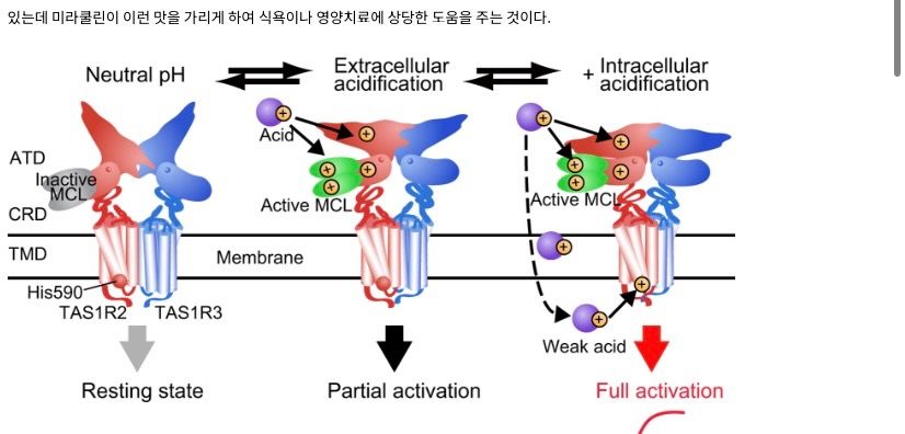 미라쿨린은 단맛수욘체에 결합한 후 중성상태일땐 작용안하다가 (그럼 중성상태일땐 오리혀 단맛이 덜 느껴지나요?) 산성 환경이 되면 어떻게 단맛을 냐는건가요? 밑에 그림이 뭘 의미하는건지 자세히 설명해주세요