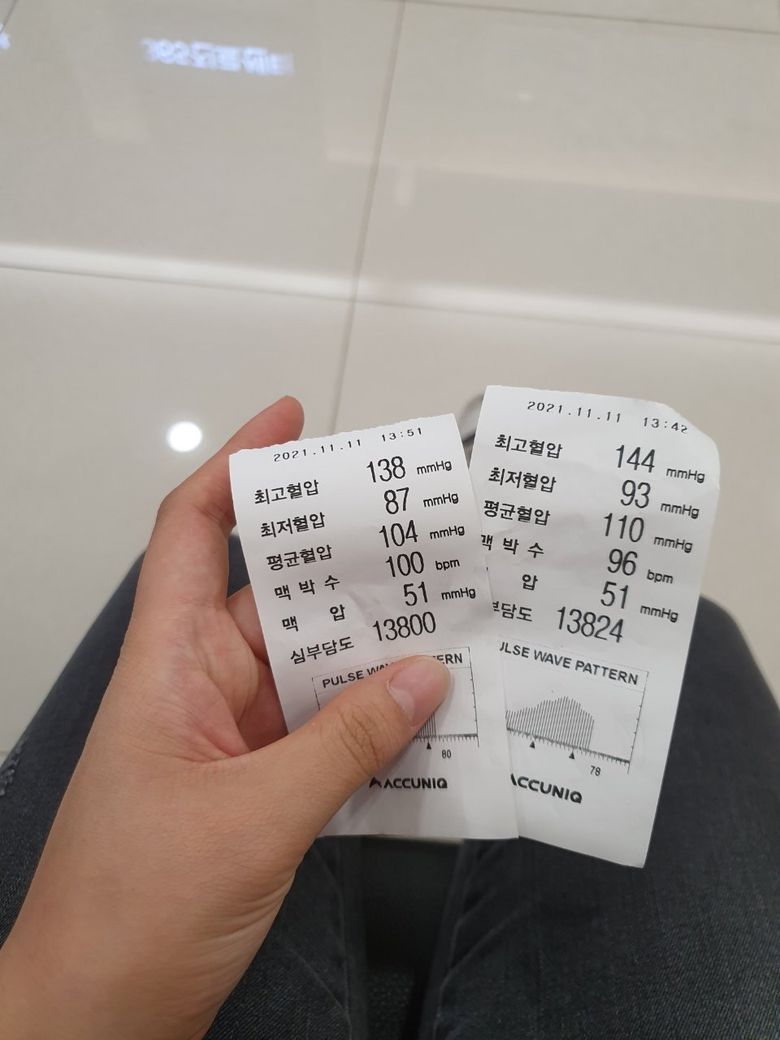 병원 가서 바로는 144, 93 나오고 9분 휴식 후 138, 87 나왔어요
