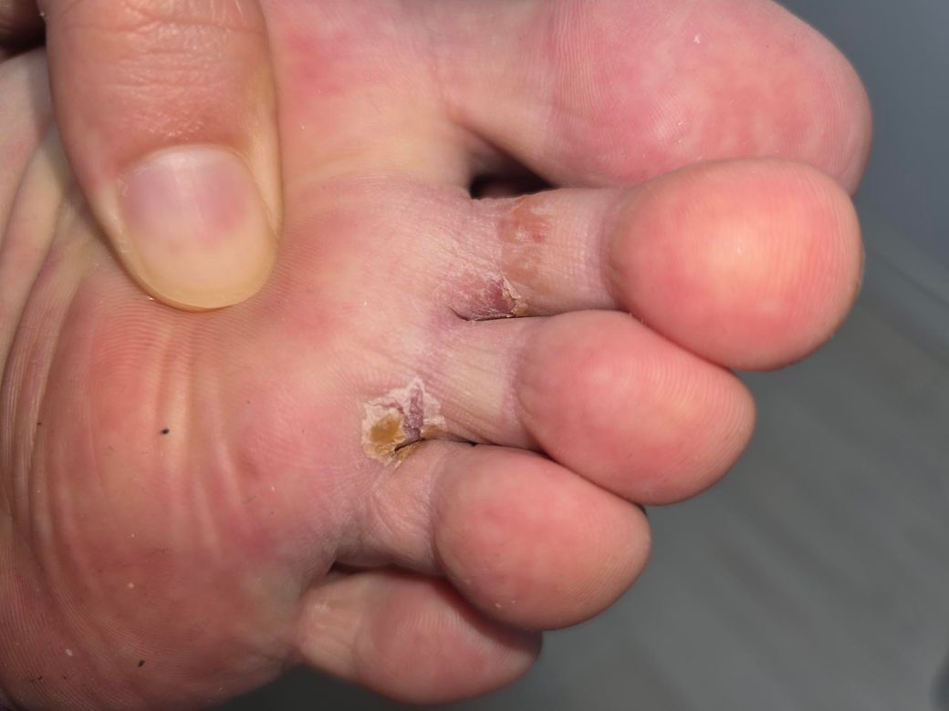 사진상으로는 발가락 사이 피부가 갈라지고 각질이 벗겨지면서 황갈색 딱지처럼 보이는 병변이 확인됩니다. 전형적인 형태를 보면 지간형 무좀(발가락 사이 곰팡이 감염) 가능성이 가장 높습니다. 특히 발가락 사이가 짓무르거나 갈라지고 하얗게 불어 있는 양상은 무좀에서 흔합니다.
