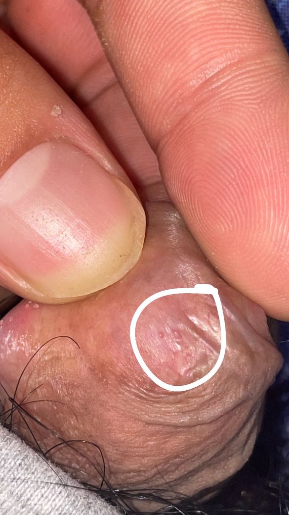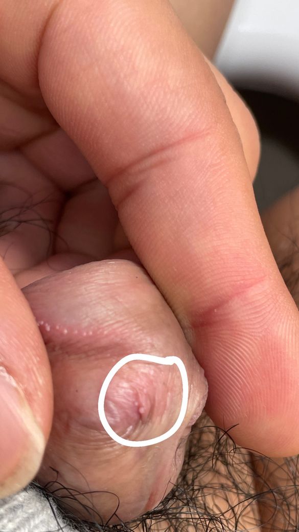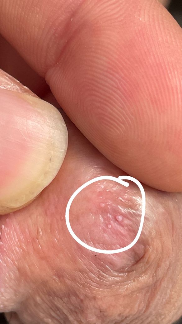 말씀하신 병변이 1) 통증이 없고, 2) 터지지 않으며, 3) 매끈한 구진 형태이고, 4) 색이 주변 피부와 유사하다면 진주양음경구진 가능성이 상대적으로 높습니다. 다만 귀두 테두리 외측이나 한쪽에 국한되어 나타나는 비전형적 형태도 보고되어 있습니다.