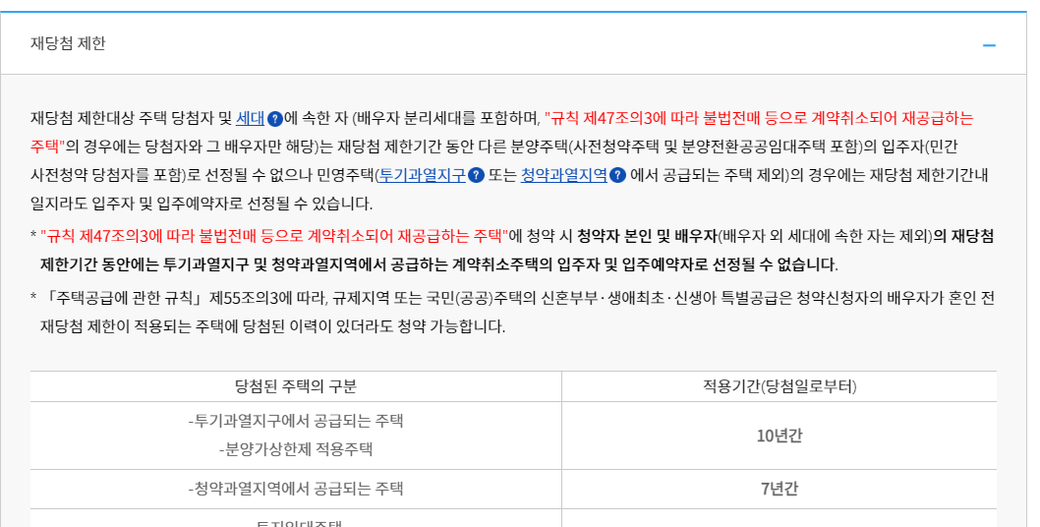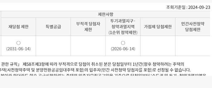 이때 넣은 청약때문에 사진처럼 재당첨제한 및 투기과열지구, 청약과열지역(1순위 청약제한)에 제한이 걸려있는데