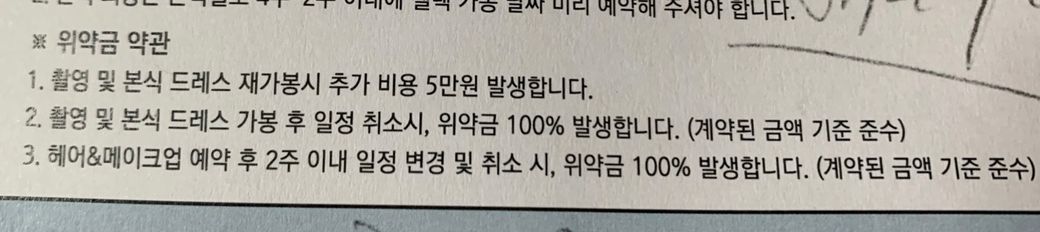 위약금은 일반적으로 계약금과 계약에 따라 진행 또는 준비된 업무에 관한 비용으로 산정이 되는바, 이러한 사정을 고려하지 않고 일률적으로 위약금을 100%라고 정하는 것은 약관규제법위반으로 무효라고 인정될 가능성이 높습니다.