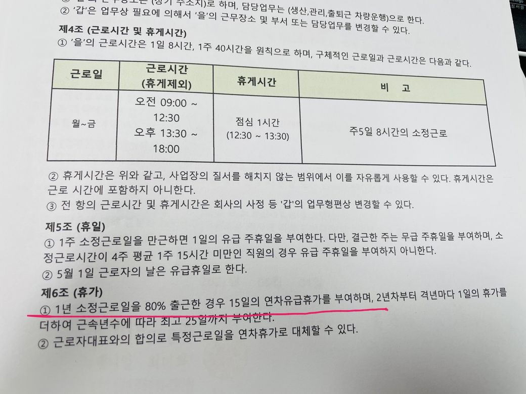 근로계약서에 1년 소정근로일을 80% 출근한 경우 15일의 연차유급휴가를 부여한다고 적혀있는데
