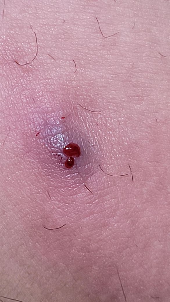 사진의 출혈은 어제 피부를 긁어내면 짤 때 좀 더 고름이 쉽게 나오지 않을까 해서 억지로 살짝 잡아뜯어서 났습니다.