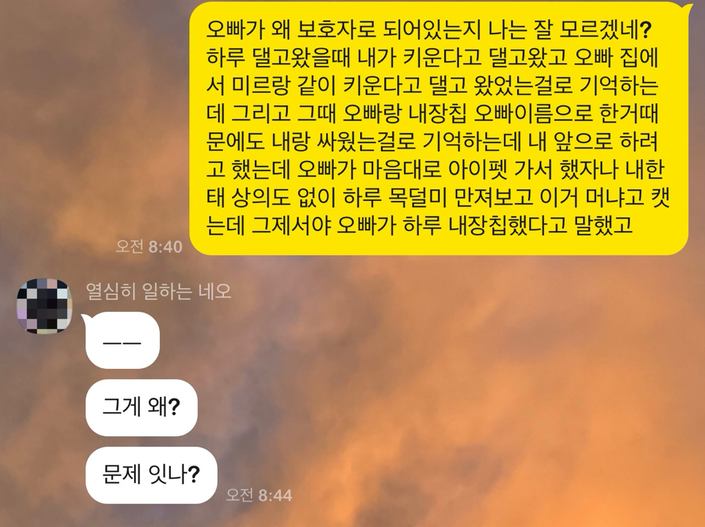 오늘 아침에 내장칩 왜 오빠껄로 했냐고 하니 자기가 보호자라서 했다고 합니다