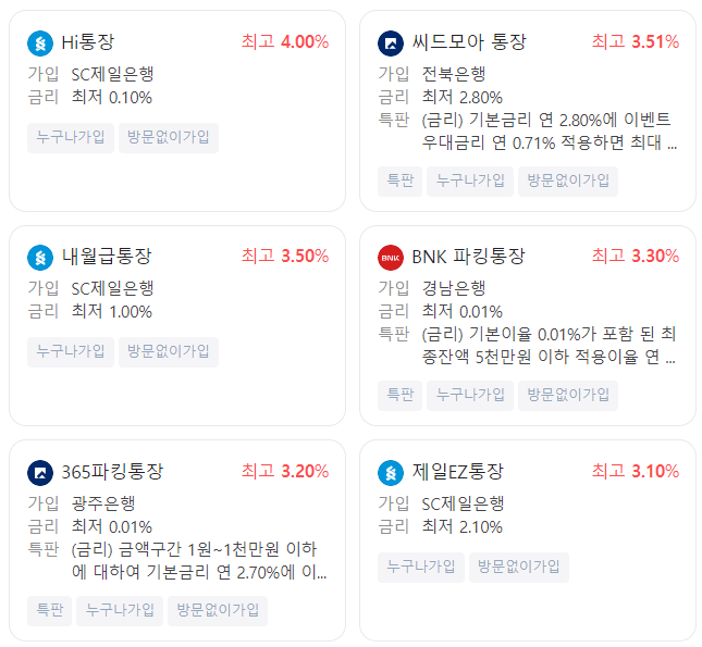 새로 가입하시는 것도 괜찮으시다면 sc제일은행도 좋을 것 같습니다. 요즘 파킹통장도 유명해지면서 금리가 점점 낮아지고 있는데 최고 4%를 제공하고 있기 때문에 메리트가 있다고 생각됩니다. 이 외에도 전북은행도 괜찮은 파킹통장이 있는데 우대금리만 본인에게 해당된다면 좋을 것 같습니다.