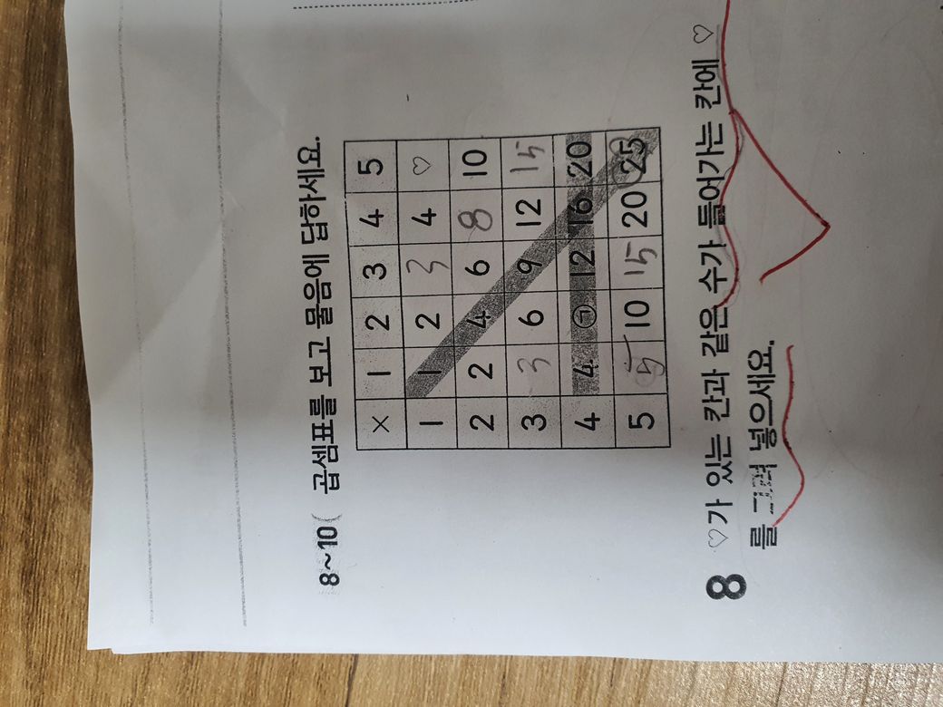 위에 5x1 5 들어가는 자리에 하트가 그려져 있으니 밑에 5 x 1자리에 5 자리에 하트를 그려야 정답인것 같습니다