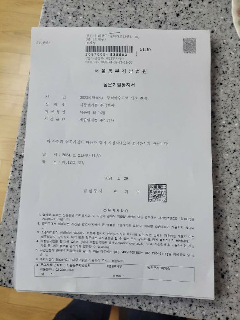 심문기일통지서(주식매수가액 산정 결정)가 왔는데 꼭 참석해야하나요??
