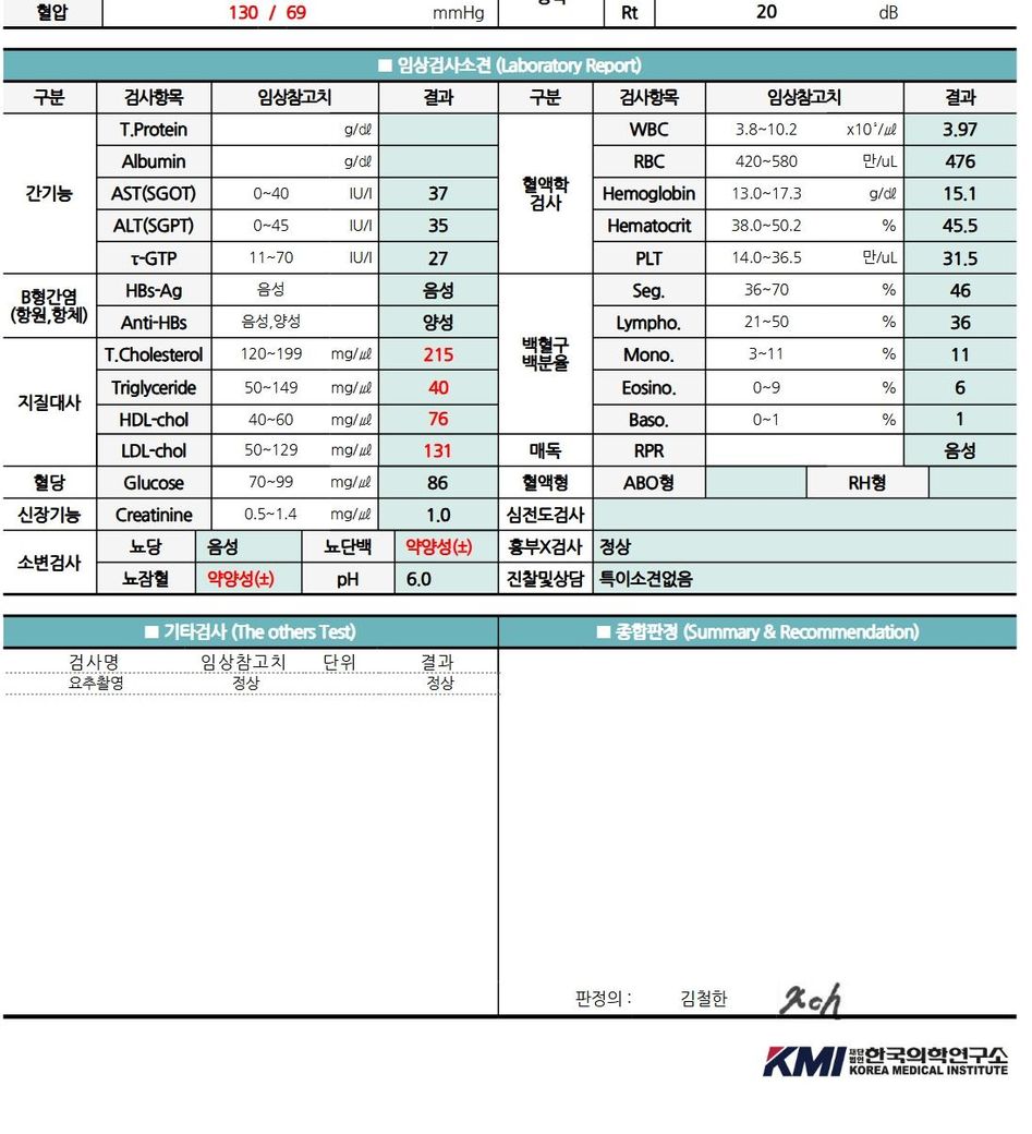 이번에 식품회사 입사전 채용 건강검진을 했습니다. 근데 종합판정에 아무말도 없으면 이 결과지를 보통 정상으로 판단하나요???