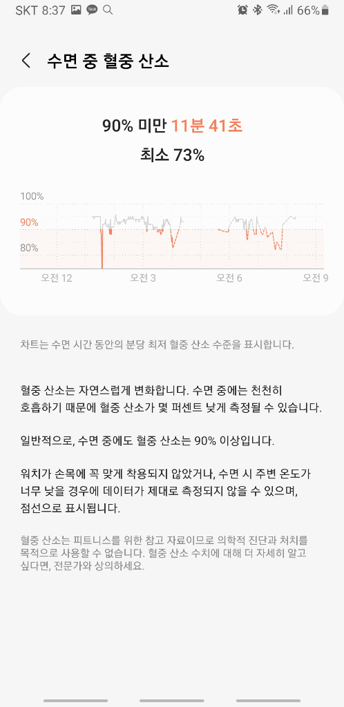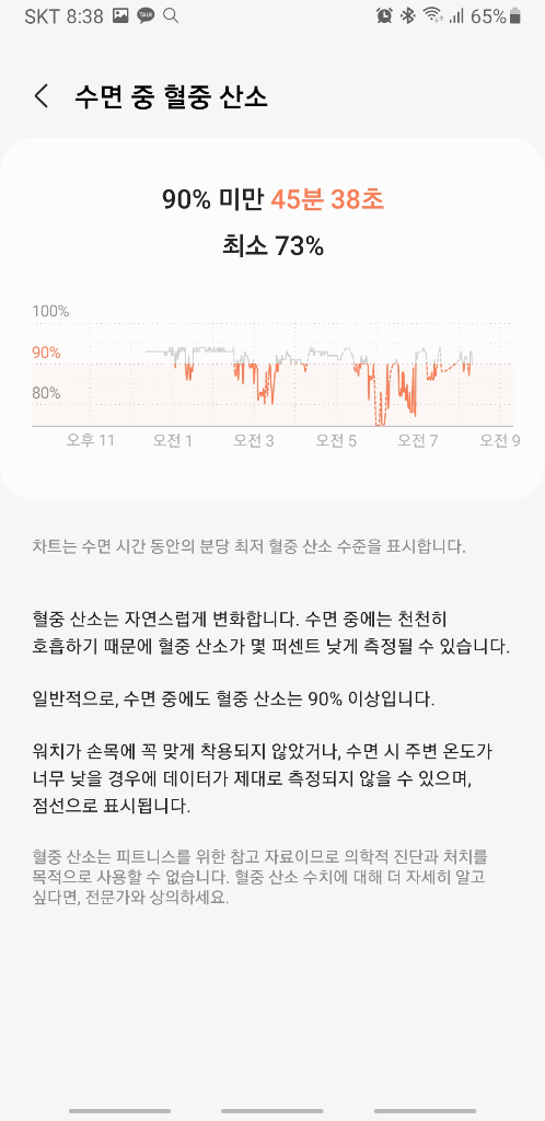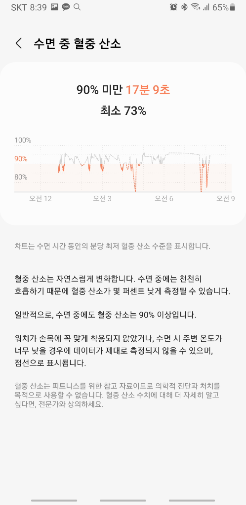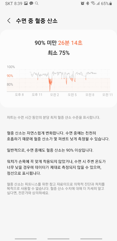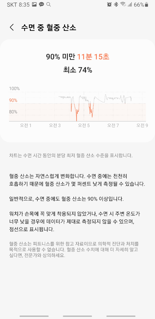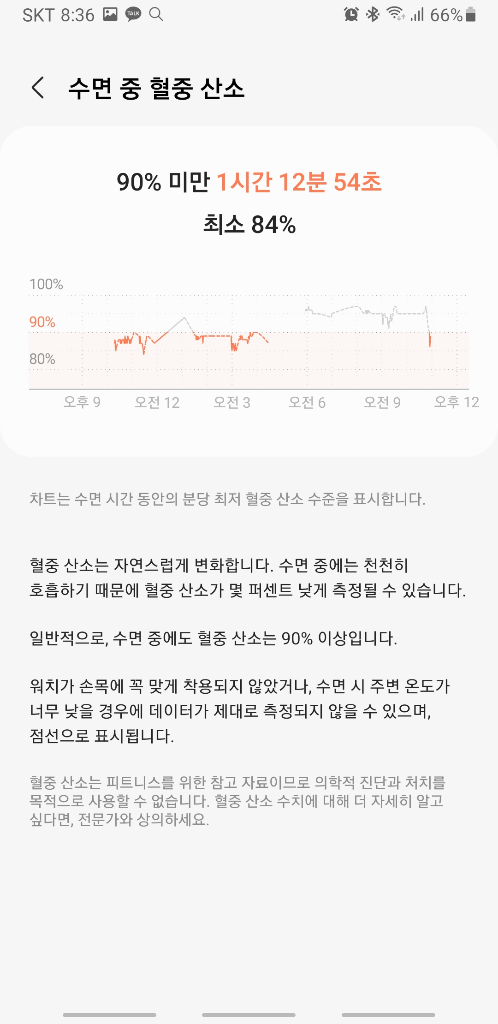 물론 워치가 의료기기가 아니니 정확한 수치는 아닐지 몰라도 인터넷이나 다른사람들 찾아보면 90밑으로는 안내려가는거 같더라고요.