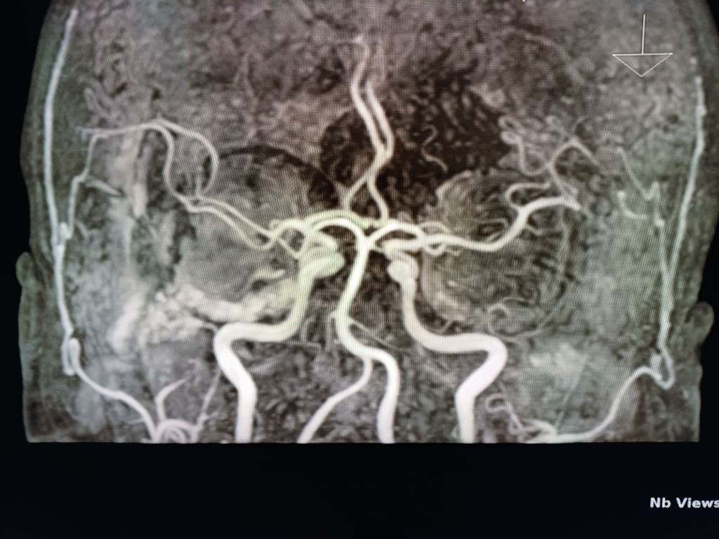 뇌실질에 이상소견 없으며 뇌혈관이 막여있거나 좁아진 부분도 보이지 않습니다