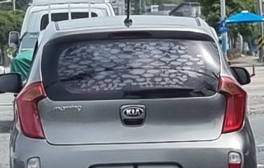 이 차의 뒷 창을 보면 썬팅이 마치 피부 물집이 잡히듯한 모습을 하고 있습니다.