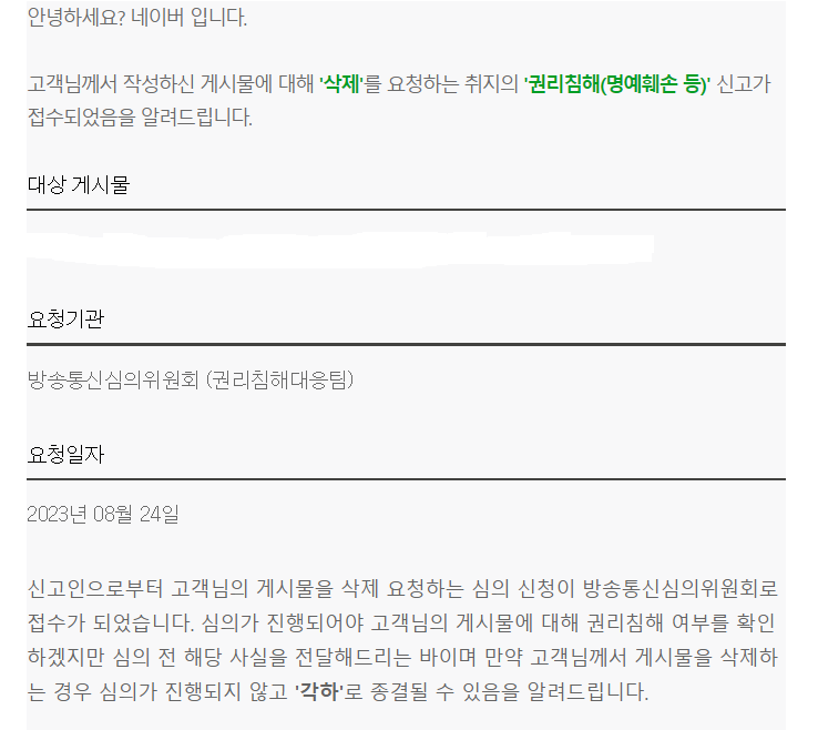 네이버 리뷰 권리침해 및 명예훼손으로 질문드립니다.